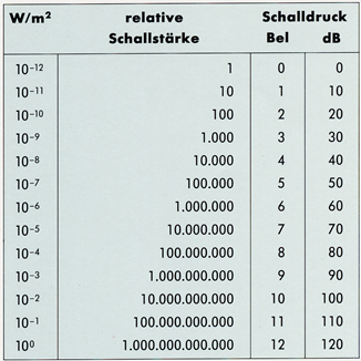 Die relative Schallstärke ist an der Schmerzschwelle etwa 1.000.000.000.000-mal höher als an der Hörschwelle. Aufgrund dieser großen Zahlen hat man sich darauf geeinigt, Schallereignisse in einem Zehntel des logarithmischen Maßstabs anzugeben. Daher nutzt man Dezibel statt Bel.